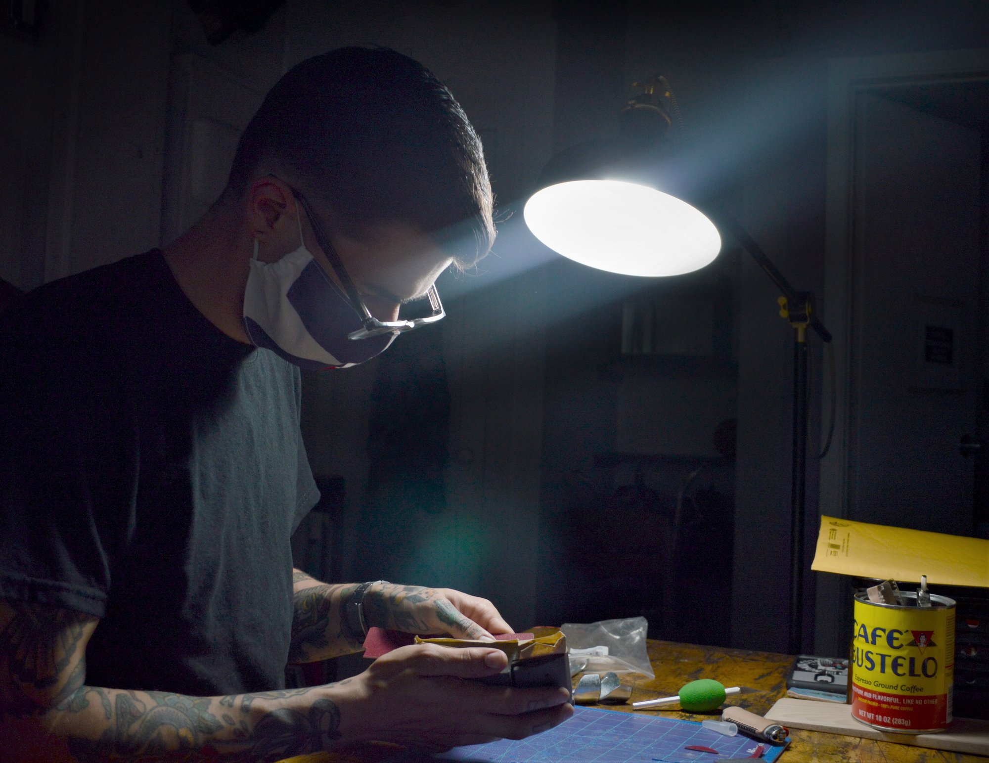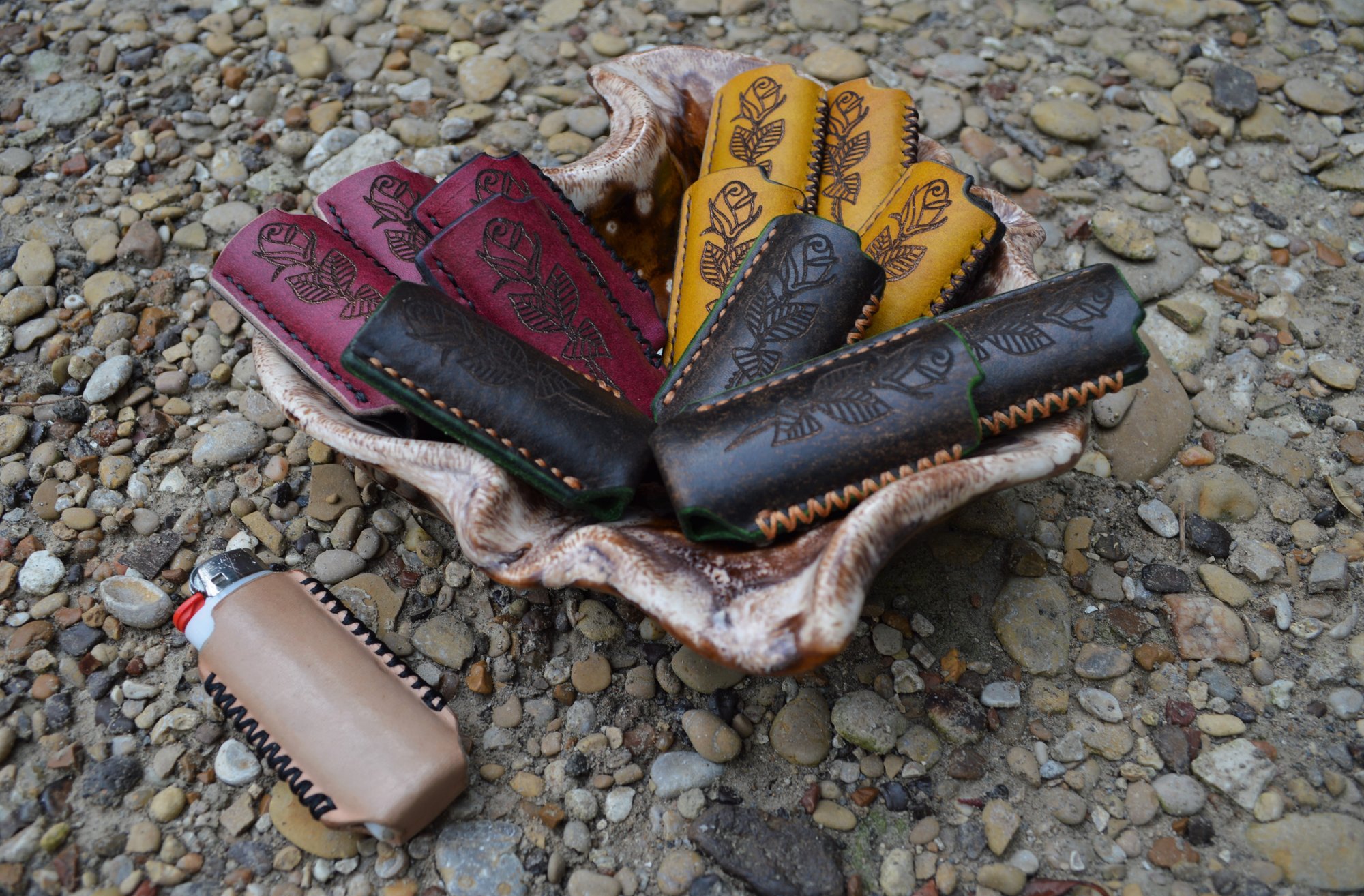 Each lighter cover is hand cut, dyed, stitched, and wet molded.